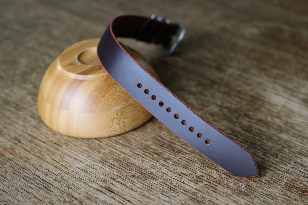Single piece watch strap made from 4 oz. Dark Burgundy pull up leather. This strap will fit wrist circumferences from 5.75 to 7 inches.